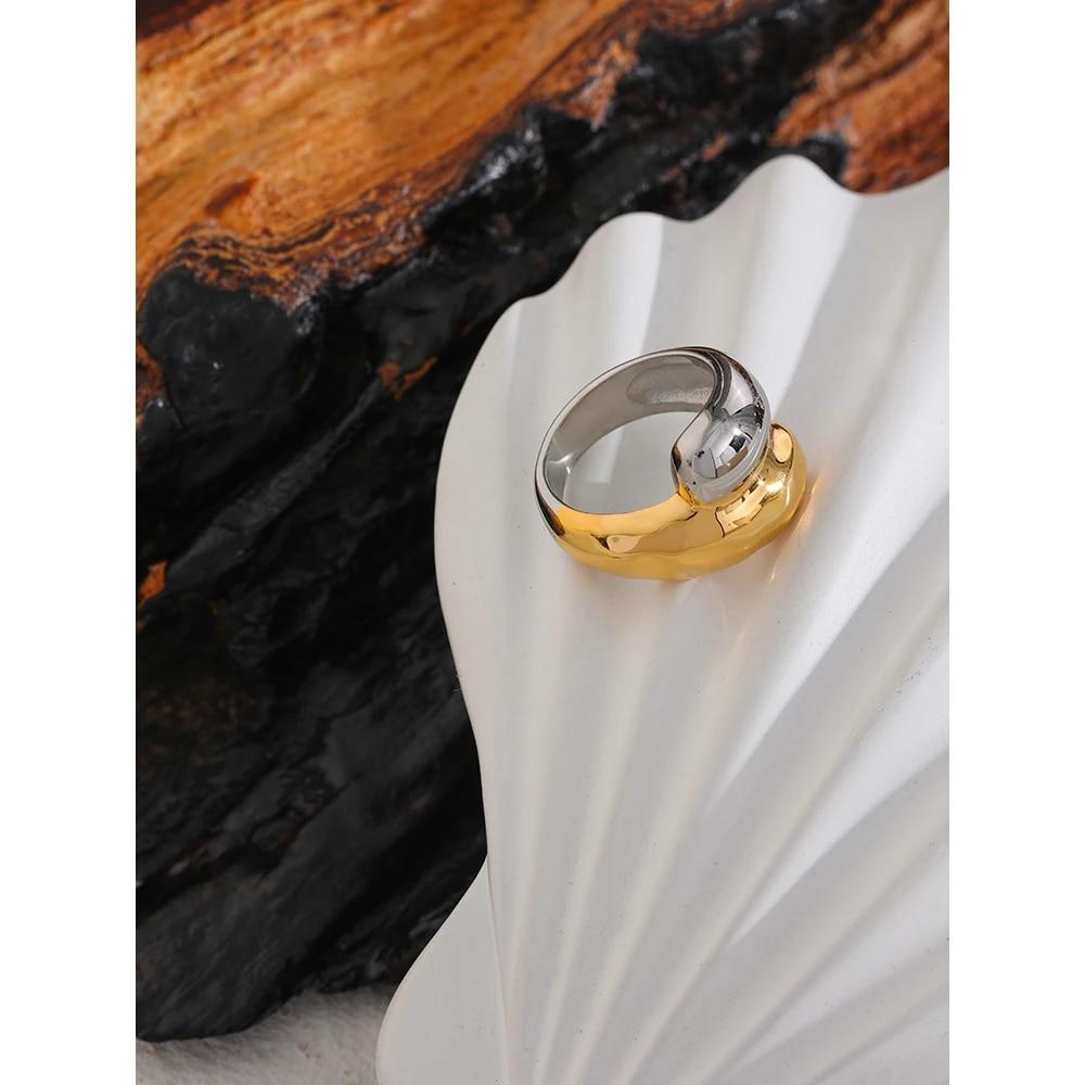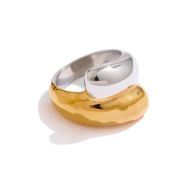 Bague Duo en acier inoxydable, composée de deux formes goutte qui se rejoignent dans un équilibre parfait. Le contraste entre la finition dorée et l’acier brut crée un effet moderne et sophistiqué. Ses lignes fluides, ses textures lisses et subtilement striées apportent du caractère sans en faire trop. Une pièce élégante, idéale pour celles qui aiment les bijoux minimalistes avec une touche contemporaine. Résistante à l’eau et durable.